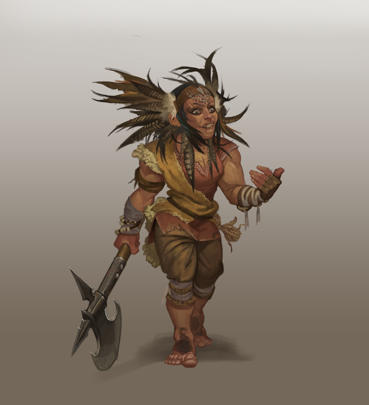 Eppalima is a halfling barbarian from Bingerton, a halfling town in the Iron Empire. She wears a feather headdress and a simple tunic, and fights with a battleaxe wielded as a two-handed weapon. Eppalima is brave--even reckless--and is determined to let the world know that she is tough as nails, heartless, and illiterate.
